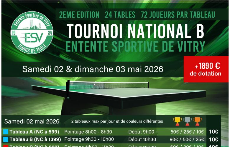 Inscriptions en ligne via HelloAsso : Tournoi National B - ES VITRY TT - 2026